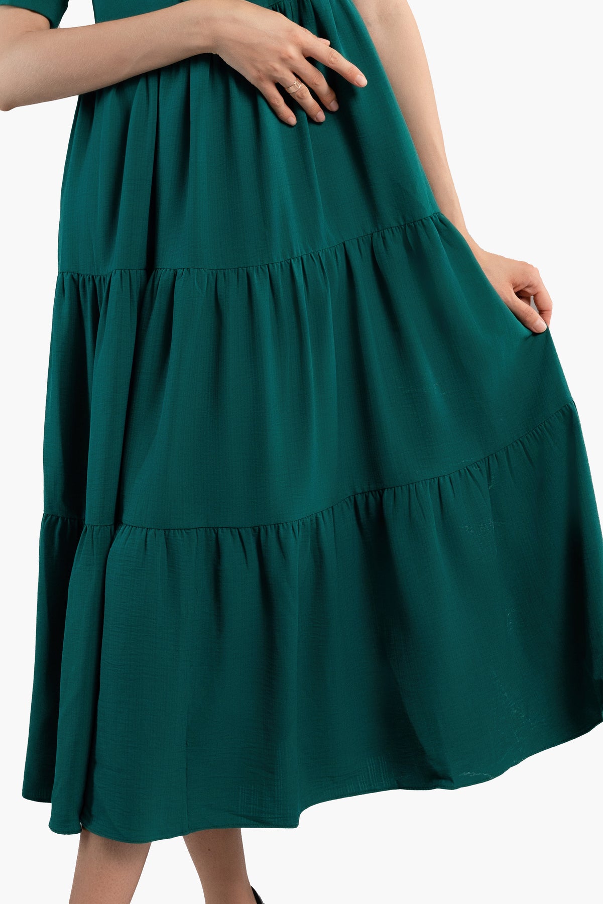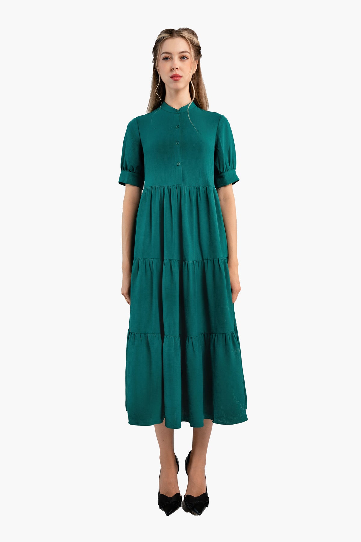 A new product from Alantino. A dress with an elegant design, but no less dynamic and youthful. Ideal midi length and classic tiered A-line skirt. This dress will fit most body shapes. Made of soft, lightweight and breathable material - perfect for Spring/Summer. Long layered midi dress design with A-line skirt, midi length, banded collar, front button, relaxed fit, tiered skirt, puffed short sleeves.